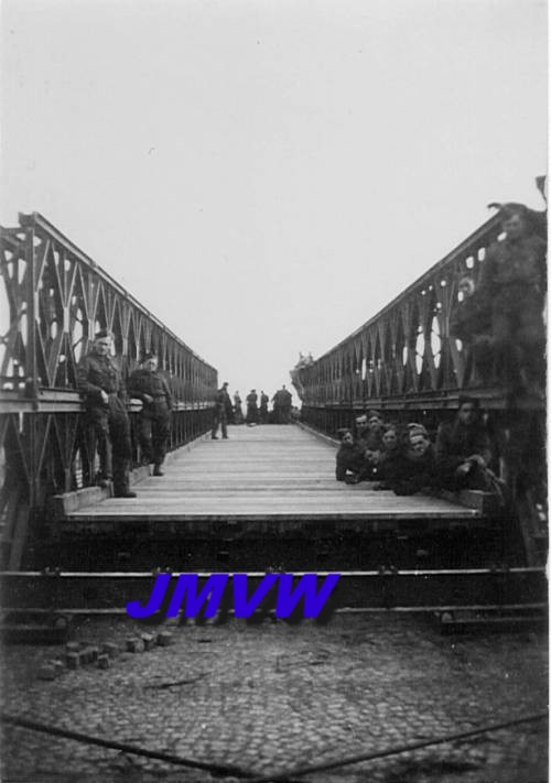 1945, Leopoldscanal, Belgium. The 1st Army Engineer Battalion contructs a Bailey Bridge. |