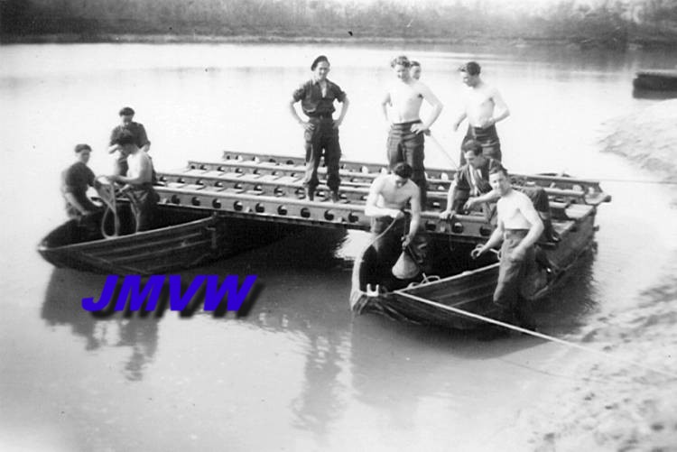 1945, Xanten, Occupied Germany. 1st Army Engineer Battalion exercises with ferrymaterial. |