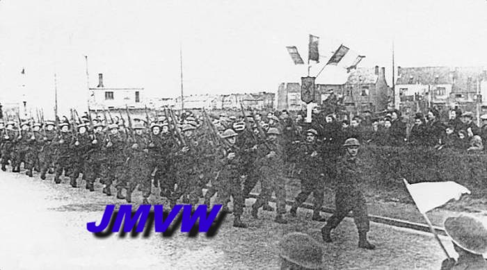 , Belgian Coast, 1945. The 3rd Company of the 1st Pioneer Battalion on parade. |