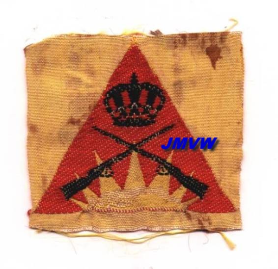 A rising sun beneath 2 crossed black rifles,and a Belgian yellow King's crown above.