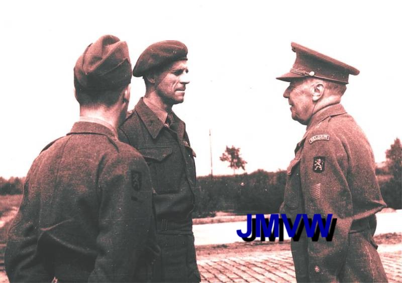 in conversation with Major BLONDEEL (middle) officer commanding of the Belgian SAS Parachutist Regiment. |