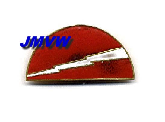 DIVISION A white lightning on a red half circular background. |
