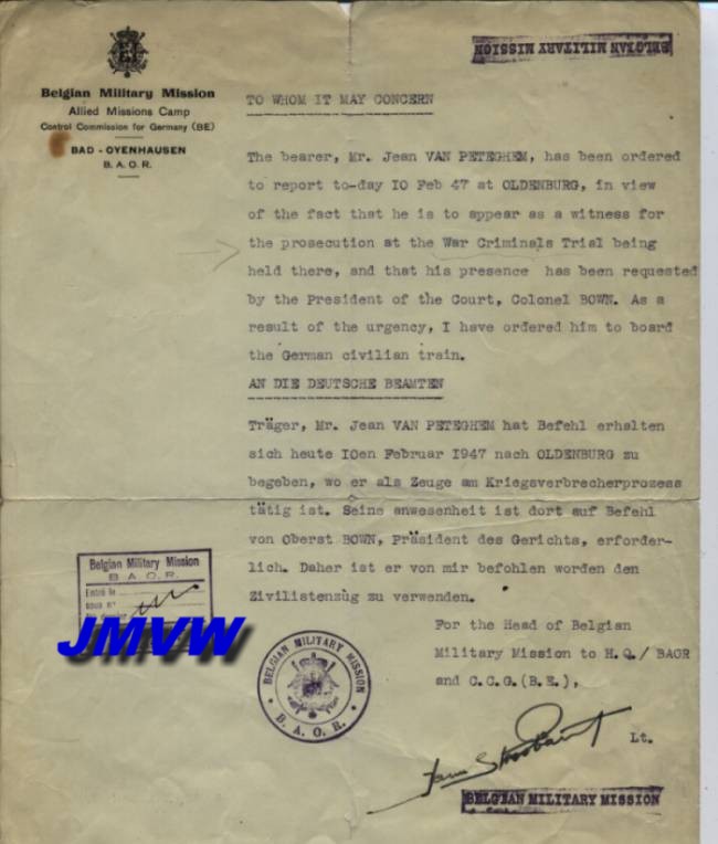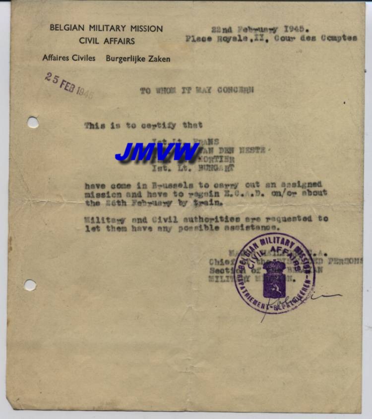 Letter with heading of the Belgian Military Mission - Civil Affairs. |
