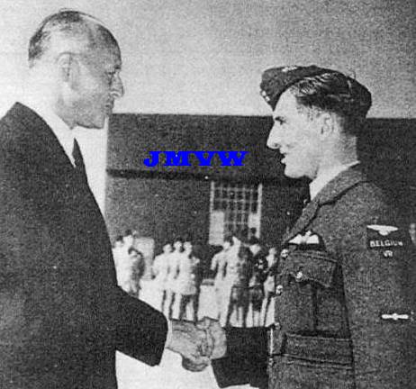 congratulating Leading Airman VAN WYMERS on the occasion of the wings ceremony, somewhere in Canada. Note the "VR" badge beneath the "BELGIUM" title. |