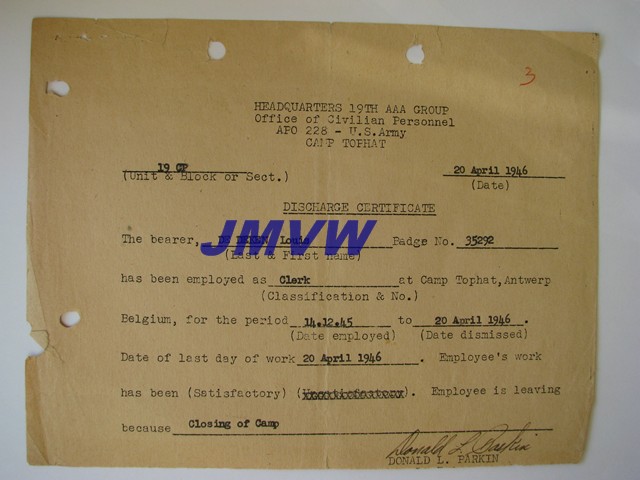 | "The history of Camp Top Hat" june 1945 - April 1946 | Camp Top Hat, discharge certificate. |