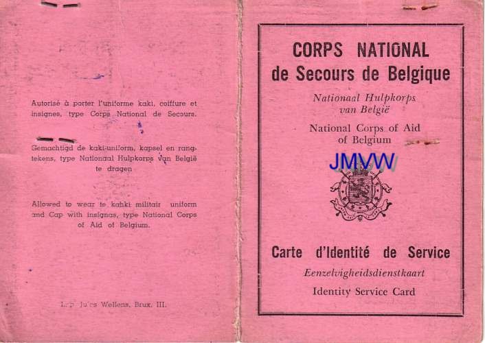 "Corps National de Secours" in French, "Nationaal Hulp Korps" in Dutch.